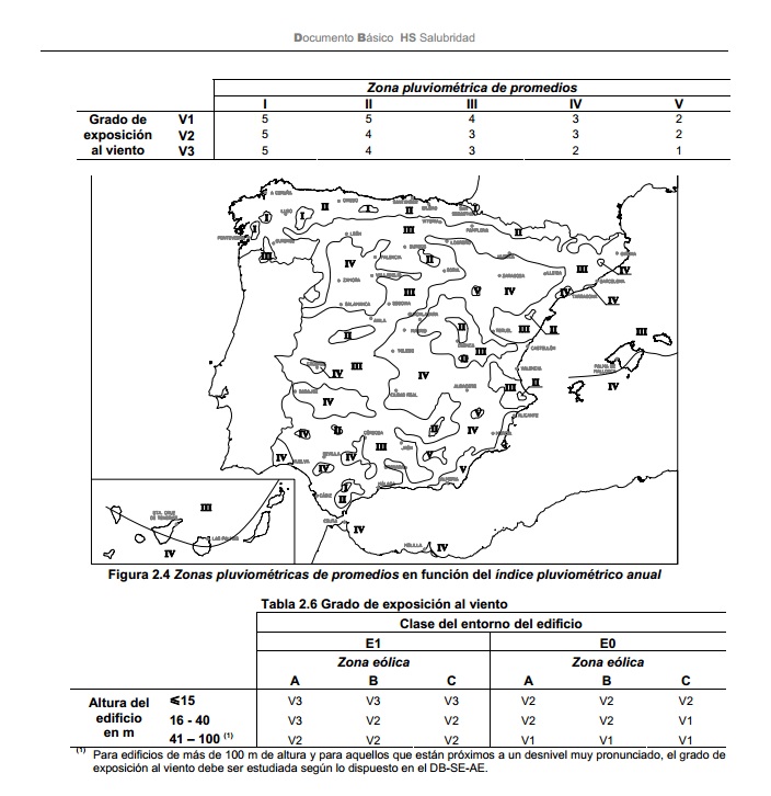 El DB HS1 establece las protecciones de los edificios frente a la humedad. En concreto en el apartado 2.3 se indica el grado de impermeabilidad de fachadas en función de la zona pluviométrica (Almería = zona V, la de menor cantidad de lluvia) y del grado de exposición del viento (V1,V2, V3) que a su vez, es función de la altura del edificio y de la zona eólica. (Canarias = C, la mayor. E0 = Terreno urbano, industrial, forestal).