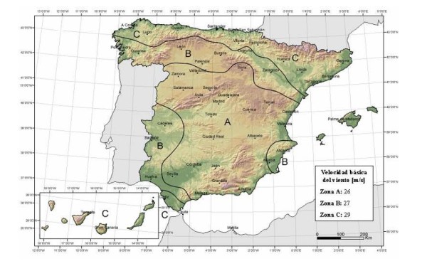 El término qb es la presión dinámica y su valor depende de la zona eólica del territorio nacional (zonas A, B y C) donde esté situada la estructura a analizar según la figura siguiente.