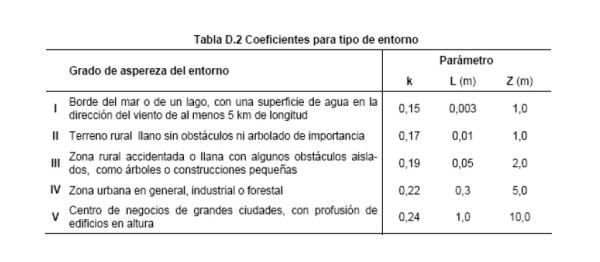 El coeficiente Ce, es el coeficiente de exposición y depende de las características del entorno (grados I, II, III, IV y V) del terreno y de la altura sobre el terreno donde esté situado el elemento a analizar (z).