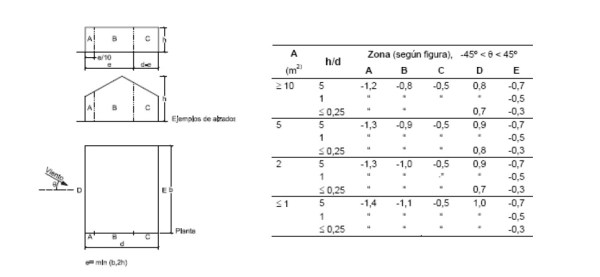 Por último, el término Cp es el coeficiente eólico, y depende de la forma y orientación de la superficie del edificio donde incide el viento, así como del área de influencia del elemento a analizar.