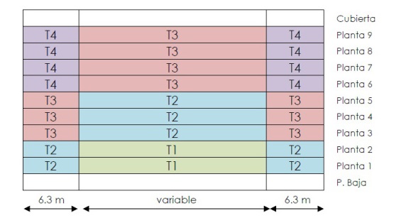 Una vez terminado el cálculo, es muy probable que se concluya que en un edificio tipo (de digamos 9 plantas, como en el ejemplo bajo este párrafo) las necesidades estructurales de los cerramientos de las plantas superiores sean mucho mayores que las de las plantas inferiores y de igual forma más elevadas para los huecos situados cerca de las esquinas. Los prescriptores decidirán entonces si colocar una tipología de cerramiento diferente en función de la zona del edificio o la más restrictiva para todo el conjunto.