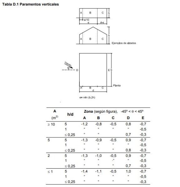 El coeficiente eólico o de presión Cp de elementos de fachada depende de la dirección relativa del viento, de la forma del edificio, de la posición del elemento considerado y de su área de influencia. Para elementos con área (A) de influencia mayor a 1 m2 y menor a 10 m2 tomamos el valor del coeficiente eólico -1,3 (el más restrictivo) de la tabla D.1 del apartado D.3 Coeficientes de presión exterior, del SE-AE (siendo negativo porque se refiere a succión).