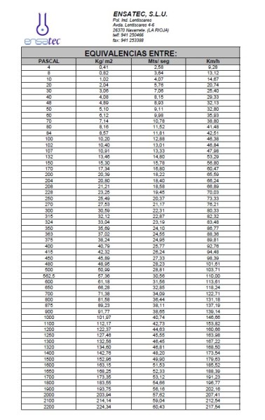 Por lo que la velocidad del viento a soportar, equivalente a 1350 Pa, sería de unos 170 km/h.